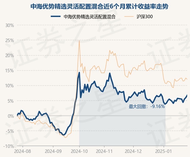 本站消息,1月27日,中海优势精选灵活配置混合最新单位净值为1.291元,累计净值为1.727元,较前一交易日上涨0.7%。历史数据显示该基金近1个月上涨0.31%,近3个月下跌2.44%,近6个月上涨6.56%,近1年上涨21.63%。该基金近6个月的累计收益率走势如下图: